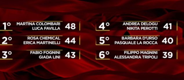Questa la classifica della manche del ripescaggio: le ultime tre coppie sono state eliminate definitivamente.