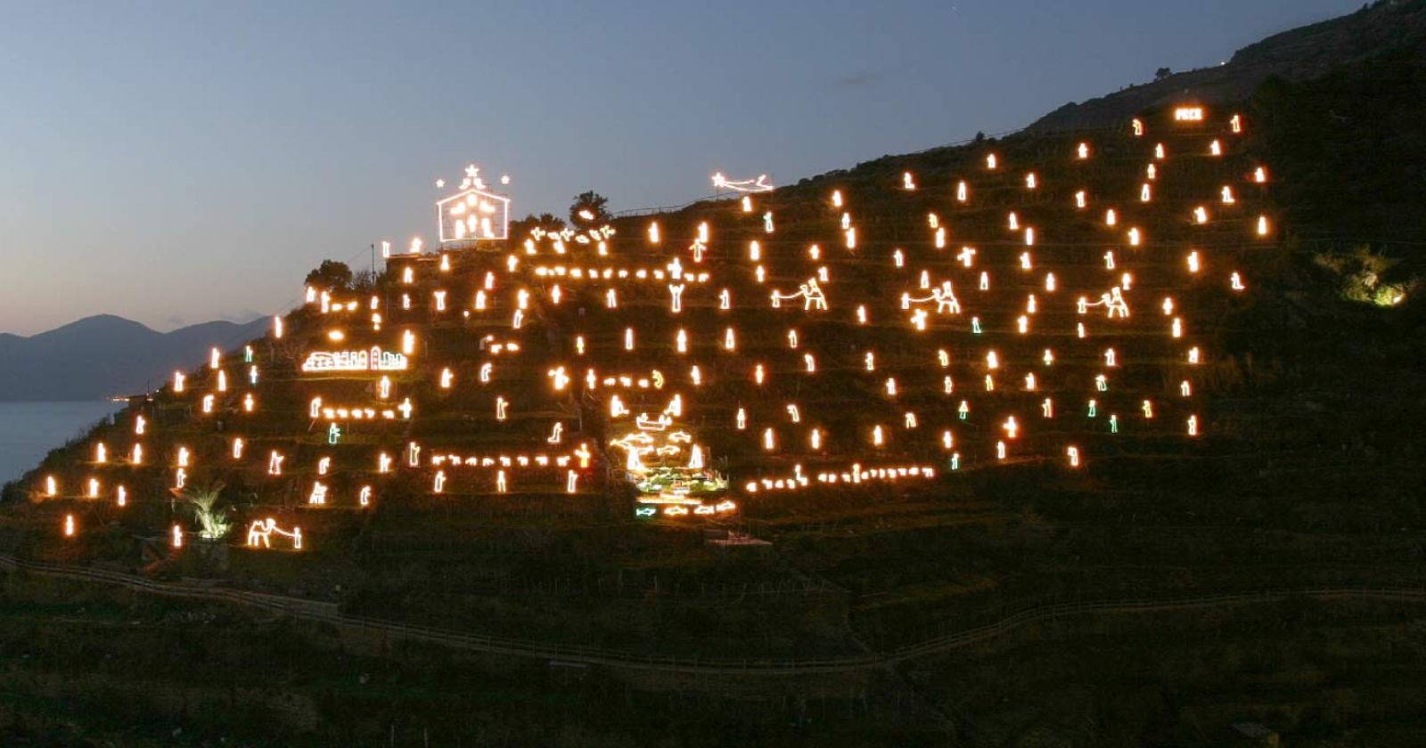 Il presepe luminoso più grande al mondo si trova in Italia, nel borgo di Manarola, una delle perle delle Cinque Terre. Questa straordinaria installazione nasce sulla Collina delle Tre Croci, luogo simbolico che domina il paese e il mare sottostante. Il progetto è stato avviato nel 1961 da Mario Andreoli, ex ferroviere che iniziò a posare le prime figure luminose per esaudire un desiderio del padre. Col passare degli anni la sua creazione è cresciuta fino a trasformare completamente un vecchio vigneto, diventando un'icona del Natale ligure e un'attrazione nota in tutto il mondo. Nel 2007 il presepe ha ottenuto il riconoscimento ufficiale del Guinness dei primati consacrandosi come la più grande installazione natalizia luminosa mai realizzata.