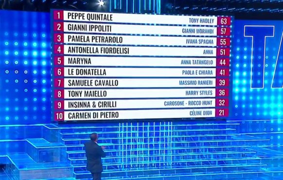 La puntata precedente, andata in onda venerdì 10 ottobre, aveva visto trionfare Pamela Petrarolo che ha conquistato pubblico e giuria con una straordinaria imitazione di Gianna Nannini, esibendosi sulle note di “Meravigliosa creatura“. Alle sue spalle si è classificato Tony Maiello mentre il terzo posto è andato alla coppia Flavio Insinna e Gabriele Cirilli.