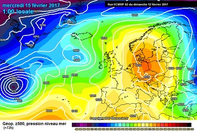La struttura anticiclonica vista da ECMWF00z per la notte fra Martedi e Mercoledi, quando dall’Europa centrale andrà estendendo la sua influenza anche sull’Italia.