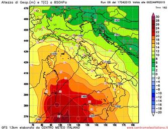 Durante il week-end arriverà aria più fredda sull’Italia che interesserà marginalmente anche le Regioni Meridionali soprattutto tra Lunedì e Martedì. A seguire, tra Mercoledì e Venerdì, un promontorio di alta pressione di origine Africana collocato tra Baleari e Sardegna si sposterà verso Est. Probabilmente sul finire della prossima settimana le Regioni Meridionali, e in misura minore anche il resto d’Italia, saranno interessate da questa massa di aria più calda in arrivo da Sud-Ovest. Le temperature a 850 hPa (1500 metri circa) potrebbero portarsi fino a +16/18 gradi al Sud con punte anche oltre i +20 gradi sul Sardegna e Sicilia. Sarebbe un veloce assaggio d’Estate con massime prossime ai 30 gradi soprattutto nelle zone più interne. Seguite i prossimi aggiornamenti per i dettagli.