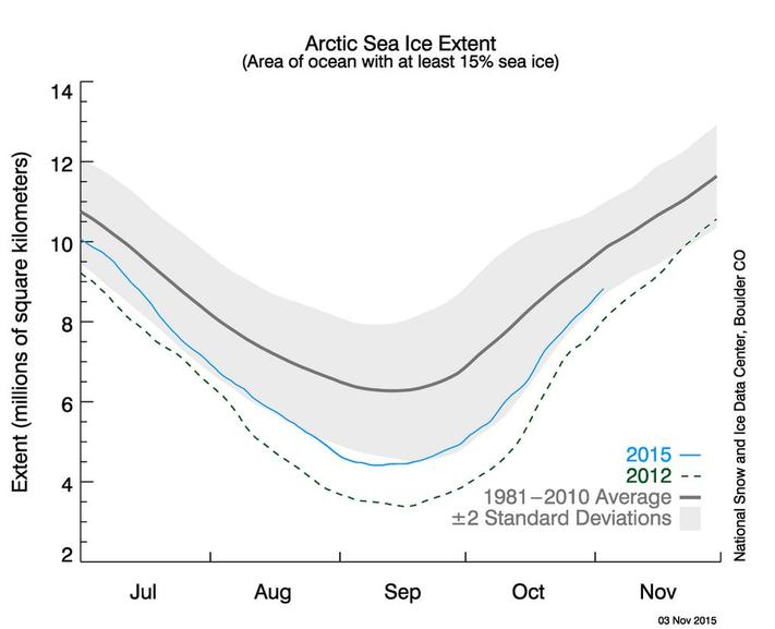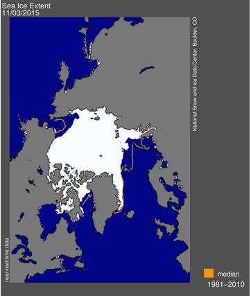 Nel mese di Ottobre 2015 il ghiaccio Artico ha ripreso ad espandersi pur tuttavia rimanendo al di sotto della media, ma l’inverno sta arrivando.