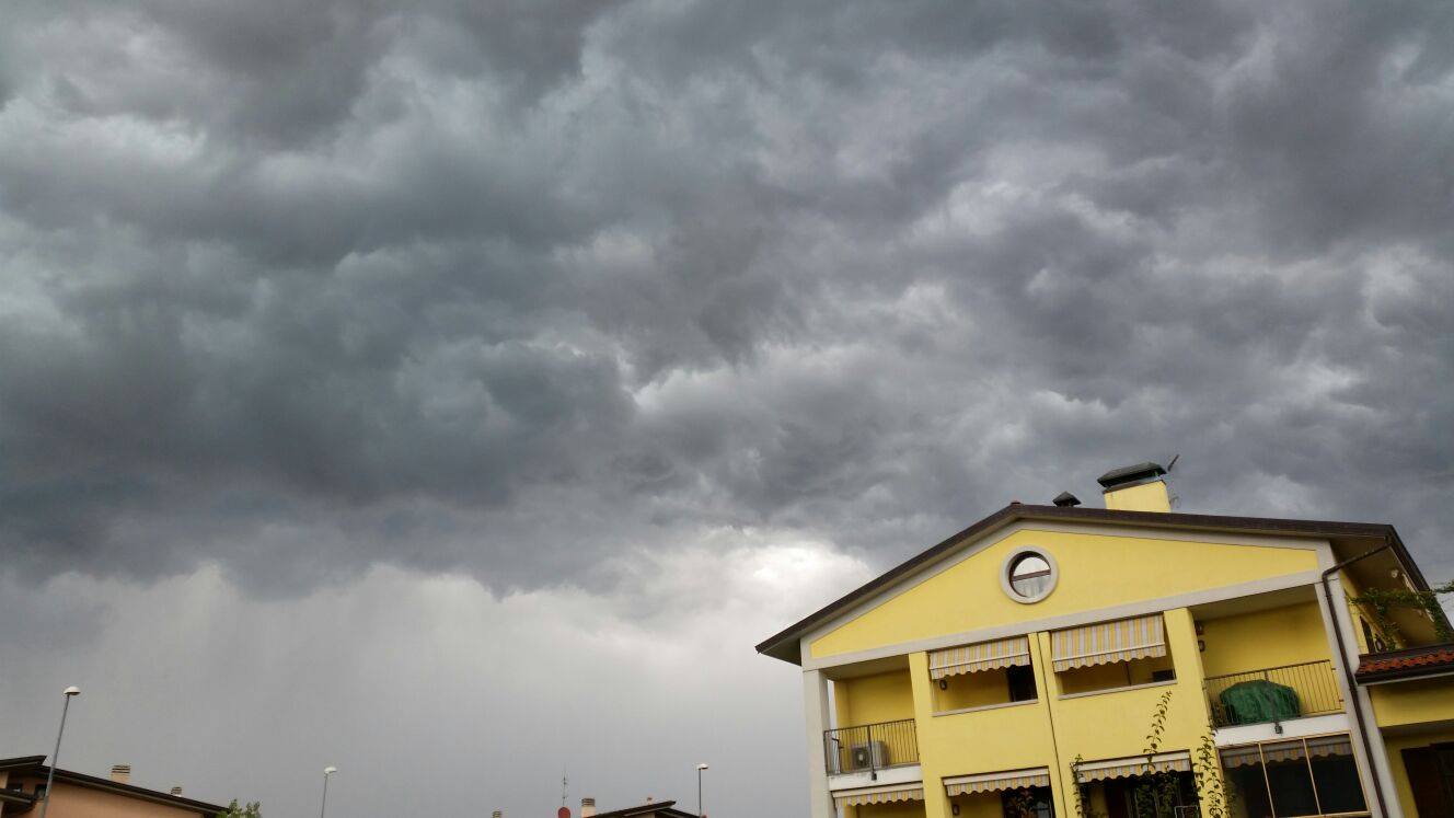 Le immagini che vi alleghiamo qui sopra ritraggono tutte le fasi preliminari dell’avvicinamento del temporale, con la shelf cloud frastagliata che avanza in direzione di Cambiago, da dove Daniele Orlandi le ha immortalate.