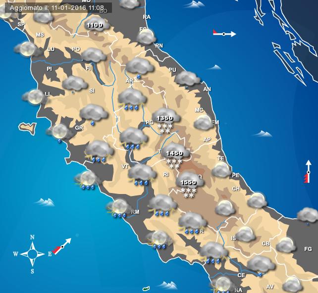 Maltempo Centro: piogge anche intese nei prossimi giorni con neve sui rilievi, 11 Gennaio 2016 – Tempo instabile sulle Regioni del Centro nella giornata odierna con precipitazioni sparse soprattutto sui versanti Tirrenici tra il pomeriggio e la sera. Non avremo comunque maltempo sul Centro poiché si tratterà per lo più di rovesci deboli o moderati. Temperature ancora piuttosto miti ma in calo nel corso della serata. Maltempo sul Centro Italia nei prossimi gironi con fenomeni anche intese e neve sull’Appennino […]
