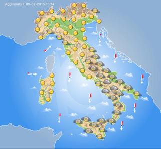 Al Sud e sulle Isole: Al mattino irregolarmente nuvoloso su tutte le Regioni con locali precipitazioni su settori interni e Sicilia Settentrionale. Al pomeriggio ancora locali fenomeni sparsi su Sicilia e Calabria. Variabilità asciutta altrove. In serata residue precipitazioni su Sicilia e zone interne Peninsulari. Neve sui rilievi oltre i 500-900 metri. Temperature minime e massime in generale aumento. Venti moderati o forti, provenienti principalmente dai quadranti Settentrionali. Mari generalmente molto mossi o agitati al largo.