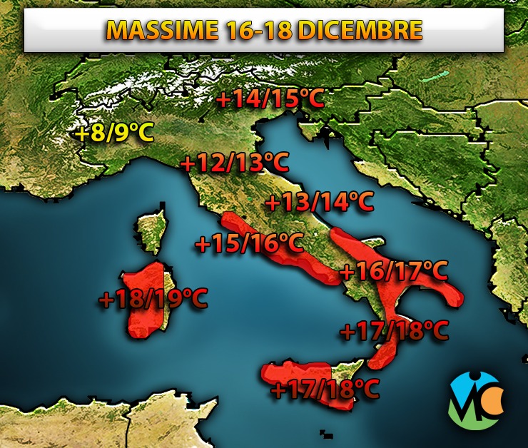 Massime previste tra lunedì 16 e mercoledì 18 dicembre.