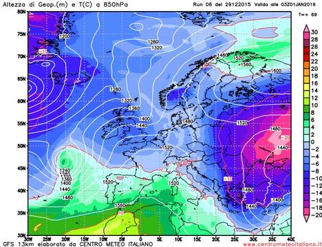 Fino a domani un campo di alta pressione con valori fino a 1030 hPa condizionerà il tempo sul Mediterraneo portando sull’Italia tempo stabile e clima mite specie in montagna. Intanto un campo di alta pressione, con valori al suolo fino a 1045 hPa, inizierà a svilupparsi sulla Scandinavia e sul suo bordo Orientale aria molto freddo di origine continentale si muoverà verso l’Europa dell’Est. Proprio in corrispondenza dell’ultimo giorno dell’anno l’Europa Orientale sperimenterà una forte ondata di gelo con temperature che su Ucraina e Romania potrebbero arrivare fino a -20 gradi a 850 hPa (1500 metri circa). Ma per Capodanno 2016 quale meteo ci aspetta invece sull’Italia? […]