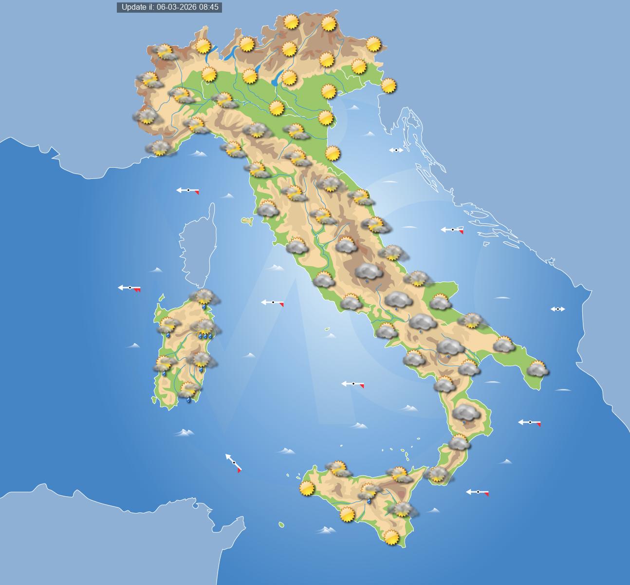 Al Sud e sulle Isole: Al mattino molte nubi sulle regioni peninsulari ma con tempo asciutto, soleggiato sulla Sicilia e qualche pioggia sulla Sardegna. Al pomeriggio instabilità in aumento con acquazzoni sparsi sulla Sardegna e locali fenomeni anche lungo l'Appennino e settori interni della Sicilia. In serata e in nottata residui fenomeni tra Calabria e Basilicata, più asciutto altrove ma ancora molte nubi. Temperature minime e massime stazionarie o in lieve rialzo. Venti deboli o moderati dai quadranti orientali. Mari poco mossi o localmente mossi.