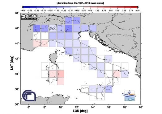 Anomalie termiche medie a scala nazionale per la Primavera 2021; fonte ISAC-CNR