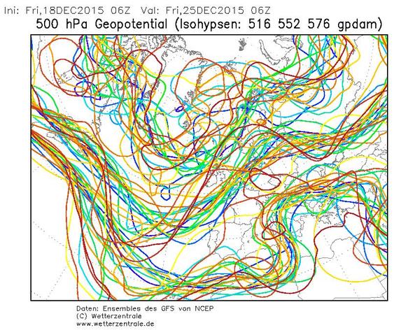 Spaghetti che mostrano il passaggio di una blanda saccatura depressionaria sul Mediterraneo Occidentale per Natale 2015 – wetterzentrale.de