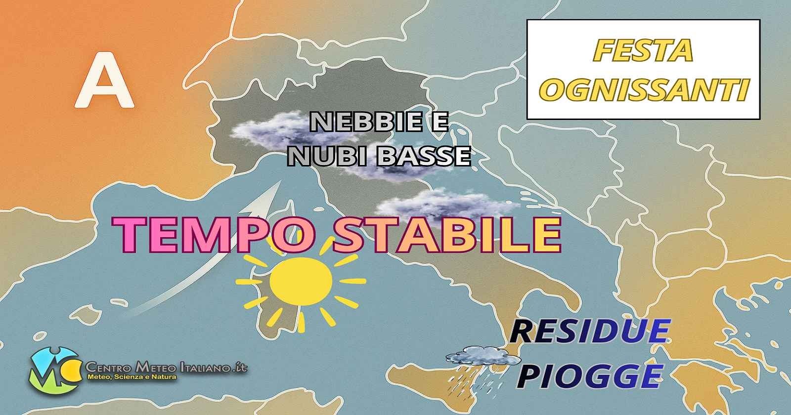 Le condizioni meteo miglioreranno per Ognissanti, con l'avanzamento di parziali schiarite e il ritorno della generale stabilità. Qualche piovasco potrà insistere solamente sull'alto versante tirrenico, in forma isolata. Un nuovo peggioramento, tuttavia, riguarderà principalmente il nord nella giornata di domenica 2 novembre, con fenomeni localmente anche intensi e neve sulle Alpi ben oltre i 2.000 metri. Relativa stabilità sembra invece poter resistere altrove, con temperature che non subiranno grossi scossoni.