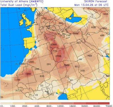 Come anticipato, il flusso meridionale che verrà richiamato dal vortice depressionario, piloterà ingenti quantitativi di pulviscolo sahariano verso il Mediterraneo e parte dell’Europa. Dalla mappa allegata raffigurante la quantità di pulviscolo sahariano prevista dal modello Skiron per la giornata di lunedì 13 aprile, si nota un elevato trasporto di dust dall’Africa verso il bacino del Mediterraneo, Balcani sino a parte del centro Europa. In particolare, il pulviscolo farà registrare un picco sull’Italia, specie meridionale, con valori colonnari superiori ai 2000 mgr/m^2. Viste le precipitazioni attese è atteso un deposito umido al suolo del pulviscolo sahariano, andando a sporcare le superfici ( come ad esempio le automobili) e determinando anche un aumento dei valori di PM10, dovuti però a particolato di origine naturale e non antropica.