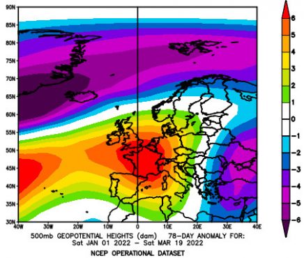 Anomalie di geopotenziale a 500 hPa dal 1 gennaio 2022 al 19 marzo 2022; fonte noaa.gov