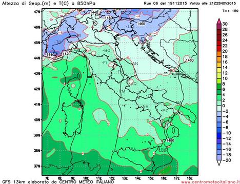 Temperature previste dal modello GFS a 850 hPa (1500 metri circa) per la sera di Mercoledì 25 Novembre 2015
