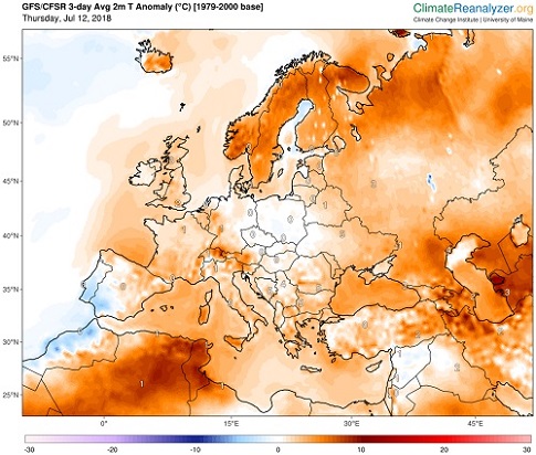 Temperature Europa: clima caldo e gradevole nei prossimi 3 giorni sul vecchio continente – 12 Luglio 2018 – Sull’Europa settentrionale ed orientale è dall’ inizio della stagione estiva che le temperature risultano superiori la media di riferimento, Scandinavia, Russia, paesi Baltici, Ucraina e Turchia stanno vivendo un’ estate molto calda con deficit positivi di temperatura anche di 3-4°c. Clima caldo previsto anche nei prossimi 3 giorni sui paesi sopra citati e su gran parte dell’ Europa, fanno eccezione invece la Germania, Polonia, Repubblica Ceca e Portogallo dove è in azione di una depressione con masse di aria più fresca in quota e genera condizioni di tempo instabile. Dalla carta delle Temperature allegata qui sulla sinistra si notano le anomalie per i prossimi 3 giorni secondo il modello GFS/CFSR, anche sul bacino del Mediterraneo le temperature saliranno e andranno oltre la climatologia di riferimento a causa dell’ Anticiclone nord-africano il quale sta espandendo i suoi massimi pressori in queste ore e raggiungerà ben presto l’ Italia. […]