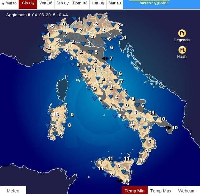 Le temperature dunque saranno in forte calo su Marche, Abruzzo, Molise, Umbria e parte di Toscana e Lazio, solamente dalla tarda notte e dalla prima mattina, in quanto nel corso della notte non arriverà impulso freddo ed in questo intervallo verranno registrate le temperature massime di domani, Giovedì 5 Marzo 2015. Per l’ora di pranzo ci attendiamo valori anche di 6/8°C inferiori rispetto a quelle registrate oggi. La neve cadrà copiosa a bassa quota sul settore adriatico (2-300 metri durante i rovesci più intensi) ma in qualche occasione potrebbero manifestarsi episodi di neve fino in pianura. Il calo delle temperature, dovuto alla massa d’aria fredda che sta per giungere da Nord, si potrà avvertire fino alla giornata di Venerdì 6 Marzo. Ecco cosa ci attendiamo per il fine settimana sull’Italia