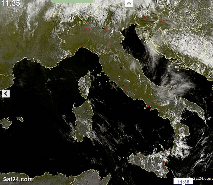 Il tempo è decisamente più stabile, abbiamo avuto temperature minime leggermente al di sotto della media stagionale, ma stanno già soffiando i primi venti da Sud, dunque a breve le temperature si riporteranno a ridosso dei 27/28°C al Nord e dei 30/31°C al Centro-Sud. Possiamo notare che su alcune zone interne della Sicilia, della Calabria e della Puglia, ci sono delle nubi a medio ed alto sviluppo verticale, con rovesci di una certa intensità che però sono ancora isolati: sono proprio queste le zone dove nel pomeriggio potrebbero formarsi dei temporali.