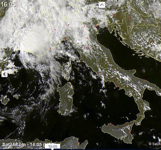 Come possiamo vedere dallo scatto satellitare allegato, si vanno formando i primi forti temporali sul Mar Ligure, dunque nelle prossime 6/9 ore ci attendiamo fenomeni di una certa intensità nel Sud del Piemonte, sulla Lombardia, sulla Toscana e sulla Liguria, mentre domani sono attesi temporali anche su Lazio, Umbria, Friuli, Veneto ed Emilia-Romagna. Sul resto della Penisola il cielo è poco o parzialmente nuvoloso.