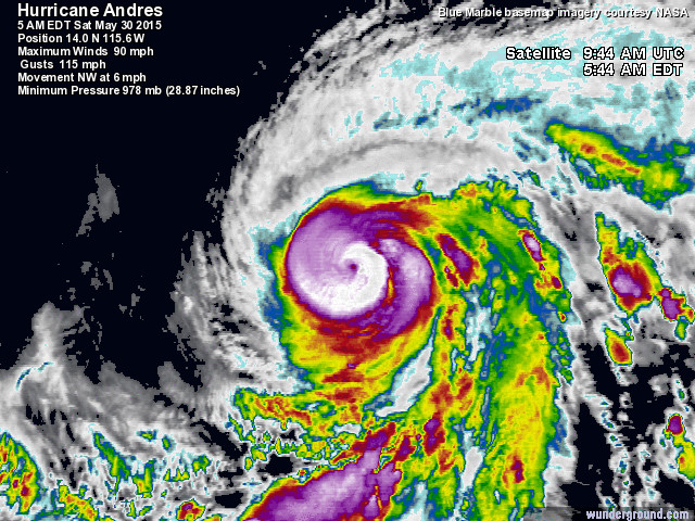 Uragano Andres a Sud-Ovest della California e del Messico raggiunge categoria 2 – 30/05/2015 – La stagione degli uragani fatica a decollare anche quest’anno sull’Oceano Atlantico (il picco delle formazione di uragani e tempeste è però, statisticamente, quello tra metà Luglio e metà Settembre) forse soprattutto a causa della presenza del nino che, a seconda degli esperti, limiterà di molto la formazione di uragani sull’Oceano Atlantico a causa di temperature superficiali dell’acqua non particolarmente elevate. Guarda qui la tendenza per i prossimi giorni sull’Italia