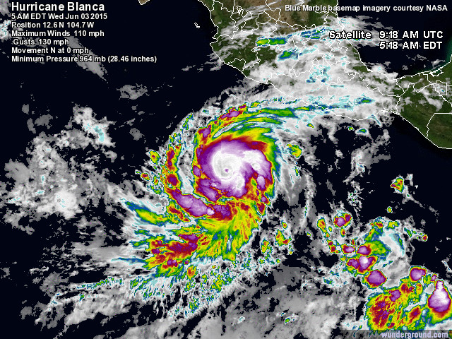 Uragano Blanca in arrivo sul Messico: landfall previsto in California – 03 giugno 2015 – Il potente uragano Andres non si è ancora attenuato nel Pacifico orientale che già un nuovo sistema sta seguendo le sue orme: Blanca infatti, il secondo uragano della stagione per la zona, ha già raggiunto la categoria 2 della classificazione di Saffir Simpson, con venti fino a 180 km/h, e sta continuando a rafforzarsi dirigendosi verso le coste del Messico settentrionale. L'uragano Blanca è atteso diventare di categoria 3 già nelle prossime ore e similmente ad Andres potrebbe raggiungere anche la categoria 4 nel corso della settimana, prima del suo probabile landfall sulla Baja California Sur tra domenica e lunedì prossimi.