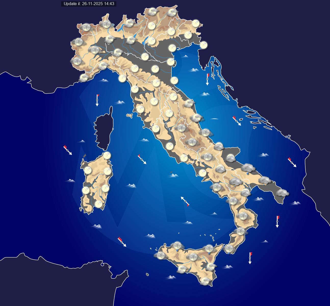Al Nord: Al mattino tempo stabile su tutti i settori con cieli sereni o poco nuvolosi. Al pomeriggio non sono attese particolari variazioni copn nubi sparse e ampie schiarite. Tra la serata e la notte si rinnovano condizioni di tempo asciutto con cieli sereni o poco nuvolosi. Temperature minime in calo e massime stabili o in lieve rialzo. Venti deboli o moderati dai quadranti nord-orientali. Mari poco mossi o mossi.