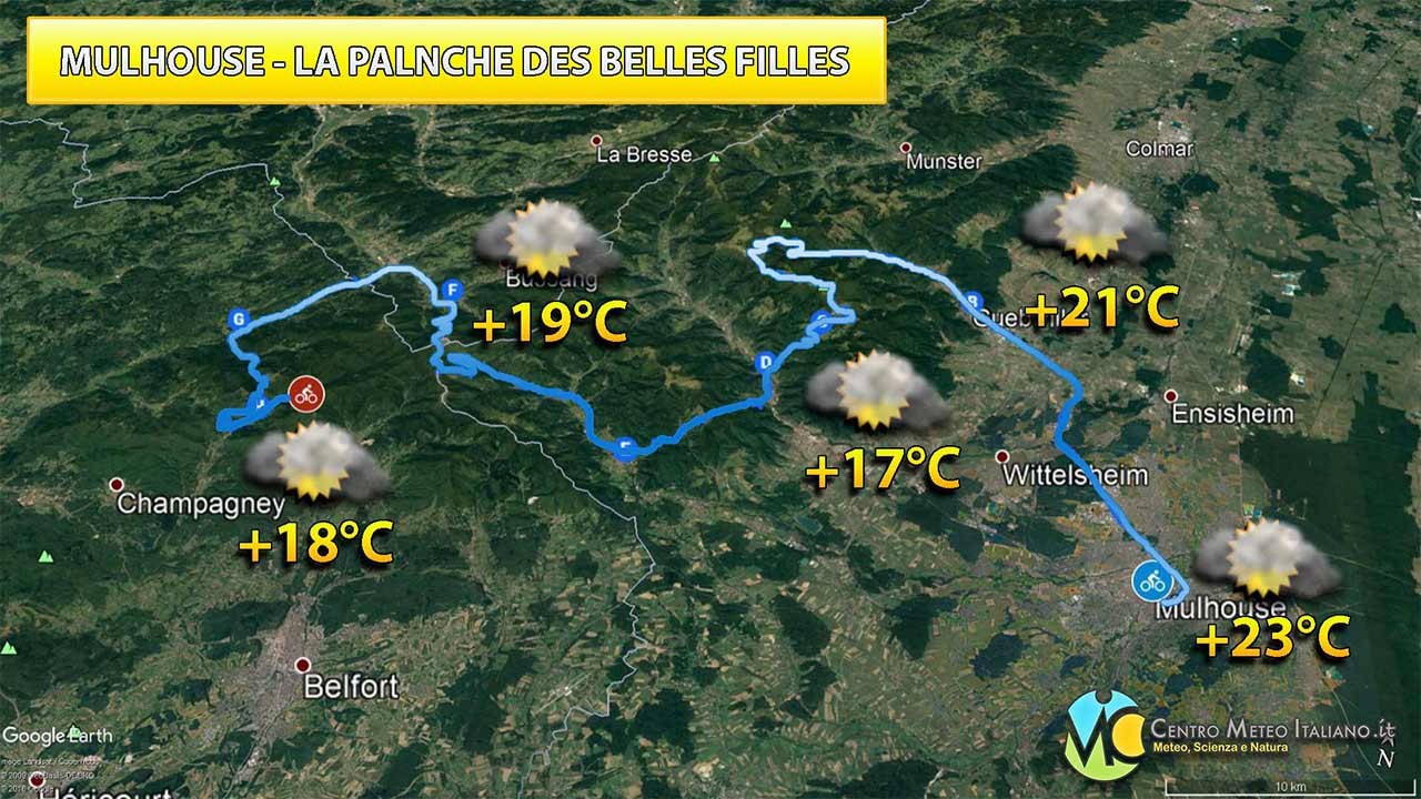 Giovedì 11 luglio 2019 – Partenza alle 13.25. Dopo un primo assaggio, i corridori affrontano un percorso alquanto impegnativo lungo 160.5 km. Sono ben 7 i GPM, di cui tre di prima categoria, compreso quello dell'arrivo di tappa, per il resto sue scalate di 2^ categoria e due ascese di 3^ categoria. Dopo un primo tratto pianeggiante, si comincia a salire al km 20 con qualche brevissimo tratto in falso piano. La scalata al primo GPM di 1^ categoria verso Le Markstein è di 10,8 km al 5,4% di pendenza media, ma subito dopo c'è da uno strappo di 1,3 km al 9% che porta al Grand Ballon, GPM di terza categoria. Un po' di riposo per gli atleti che affrontano una discesa di circa 17 km, dopodichè si sale verso Col du Hundsruck, GPM di seconda categoria, che prevede una salita di 5,3 km al 6,9% con raggiungimento della vetta al km 74. La successiva cima è collocata al km 105, Ballon d'Aslace è un GPM di 1^ categoria, per arrivarci i corridori devono effettuare una scalata di 11 chilometri al 5,8%. Dopo l'ennesima discesa, una salita di 3,3 km al 6,1% che porta al Col des Croix, GPM di terza categoria che svetta al km 123,5. Il tempo di scendere per prendere fiato, poi si riprendere a salire, fino ad un tratto abbastanza duro, visto la fatica che hanno già sulle gambe i corridori, lungo 3,5 km al 9,5% che porta al Col des Cheveres, GPM di 2^ categoria. 10 chilometri in discesa e poi finalmente l'ultima fatica da affrontare: una salita di 7 km all'8.7% di pendenza media, che porta al traguardo di La Planche des Belles Filles.