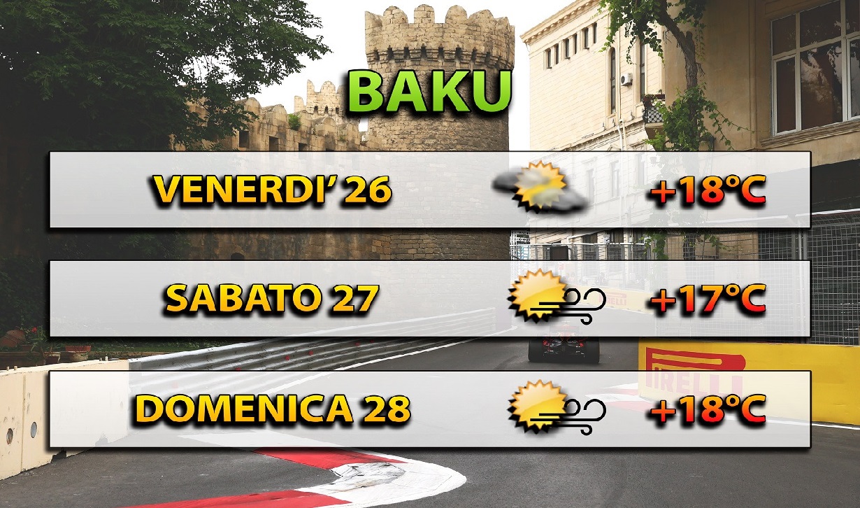 L'anticiclone sarà il protagonista sul Caucaso nei prossimi giorni, almeno secondo le ultime uscite dei principali modelli meteo. Tempo stabile dunque in Azerbaijan per il Gran Premio nella capitale Baku, con cieli generalmente sereni sia venerdì che poi nel weekend per qualifiche e gara. Non ci sono preoccuapzioni quindi sotto il profilo meteo ma attenzione ai venti che potrebbero risultare anche moderati dai quadranti meridionali specie sabato e domenica. Clima generalmente mite, con massime fino a +17/18°C.