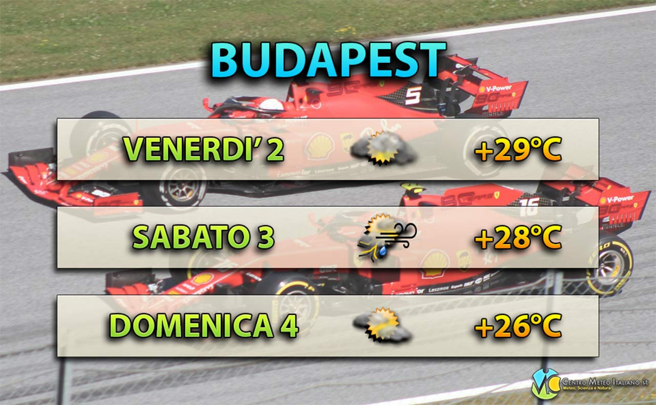 Condizioni meteo generalmente stabili sull'Ungheria nei prossimi giorni anche se non si escludono locali fenomeni di stampo pomeridiano con correnti più fresche e instabili nord occidentali che affluiscono in quota. In particolare per la giornata di venerdì 2 agosto il tempo rimarrà asciutto all'Hungaroring per entrambe le sessioni di prove libere, anche se i cieli risulteranno irregolarmente nuvolosi. Sabato 3 invece c'è il rischio che qualche acquazzone o temporale possa raggiungere il circuito proprio al pomeriggio, con dunque la possibilità di vedere delle qualifiche bagnate secondo le ultime uscite dei modelli. Domenica 4 per la gara il tempo tornerà a migliorare: non sono attesi fenomeni di rilievo con cieli poco o parzialmente nuvolosi. Per quello che riguarda le temperature, le massime rimarranno comprese tra +26°C e +29°C, mentre i venti risulteranno a tratti anche moderati da Nord Ovest specie nel weekend.