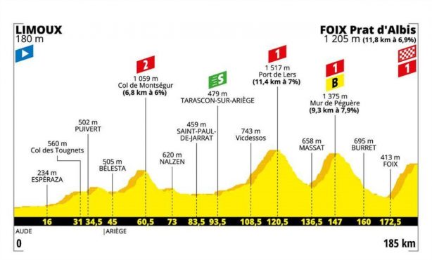 Domenica 21 luglio 2019 – Altro percorso di montagna, lungo 185 km. Dopo quasi 54 chilometri percorsi in un terreno mosso e tendenzialmente in salita, i corridori affronteranno la scalata al Col de Montsegur, GPM di 2^ categoria: 6,8 km al 6%. Dopo circa 40 km in relax, si sale verso un altro GPM di prima categoria: Port de Lers, con un’ascesa di 11,4 km al 7%. Il tempo di scendere e poi di nuova una salita di 9,3 km al 7,9%, che porta al GPM di 1^ categoria: Mur de Peguere al km 147. Seguono 25 chilometri in discesa, prima dell’ascesa finale di 11,8 km al 6,9%, che porta all’arrivo di tappa al km 185, Foix Prat d’Albis, GPM di prima categoria.