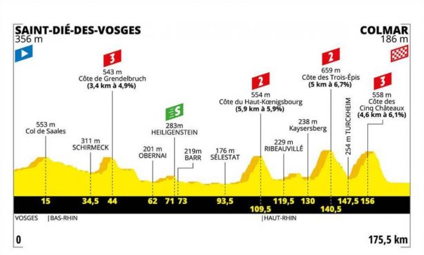Mercoledì 10 luglio 2019 – I corridori iniziano ad affrontare le prime vere salite della Grande Boucle 2019, c’è terreno fertile per portare a compimento una fuga. Il percorso misura 175.5 km, ci sono 4 GPM, due di 2^ categoria e due di terza categoria. Si parte quasi subito in salita fino a Col de Saales al km 15, poi si scende per una ventina di chilometri, di lì a poco inizia la scalata verso il Colte de Grendelbruch, GPM di terza categoria: 3.4 km al 4,9%. Tratto in discesa, poi un altro pianeggiante e poi di nuovo giù prima di affrontare un lungo tratto prevalentemente pianeggiante fino al km 104, quando si sale per 5.9 km al 5,8% di pendenza verso il Cote du Haut-Koenigsbourg, GPM di 2^ categoria. I corridori affrontano la discesa e poi un tratto in saliscendi. Al km 135.5 si sale verso un altro GPM di 2^ categoria, il meno facile della giornata: Cote des Trois-Epis, un’ascesa di 5 km al 6,7%. Si ritorna giù, ma al km 151.4 si riprende a salire verso Cote des Cinq Chateaux, GPM di terza categoria, che prevede una scalata di 4.6 km al 6,1%. Giunti alla vetta, discesa ripida di circa 9 chilometri e poi tutta pianura per almeno 10 km fino all’arrivo.
