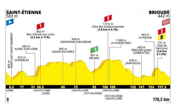 Domenica 14 luglio 2019 – Tappa collinare non particolarmente dura, infatti ci sono 2 GPM di terza categoria, e uno di prima categoria che però viene affrontato dopo soli 31 chilometri su un percorso totale di 170,5 km. Dopo un saliscendi e un tratto pressochè pianeggiante, si sale per 3,2 km con pendenza media all’11% per affrontare il Mur d’Aurec-sur-Loire. A seguire un lungo tratto un po’ mosso che si conclude con una discesa che anticipa la scalata di 7,8 km al 4,1% verso Cote des Guillumanches, GPM di terza categoria. Ancora discesa e pianura si alternano, a parte un breve tratto in salita, e poi si affronta l’ultima ascesa di tappa: 3,6 km al 7,2% per il GPM di terza categoria Cote de Saint-Just, situato a 13 km dall’arrivo, che sono prevalentemente in discesa.