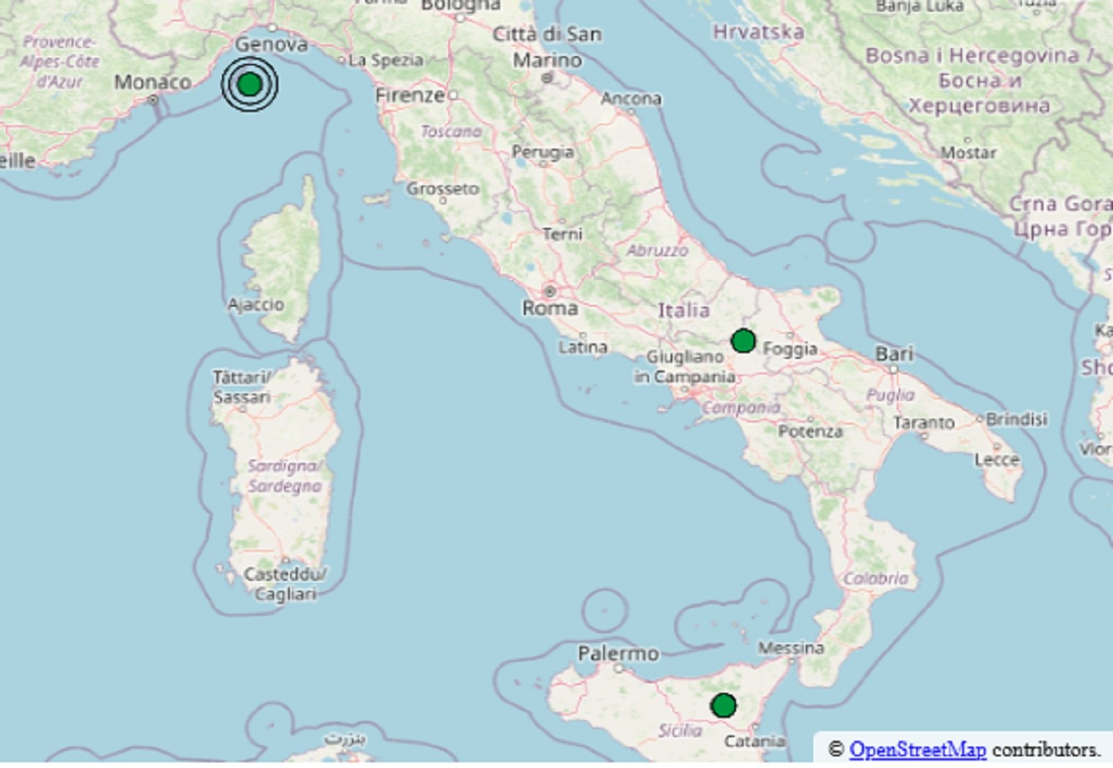 L'Istituto Nazionale di Geofisica e Vulcanologia ha registrato stanotte, alle ore 01:32 di oggi, mercoledì 5 novembre 2025, una scossa di terremoto di magnitudo 2.4 che fino a ora risulta essere la più forte della giornata. Il sisma in questione ha avuto epicentro al largo della Costa Ligure centro occidentale (Savona), con ipocentro profondo 17 chilometri. Nessun comune entro 20 km dall'epicentro, l'evento sismico è stato localizzato a 49 km da Savona e a 64 da Genova.