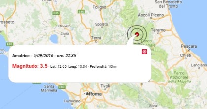 00:06 Nella serata di ieri, lunedì 5 settembre 2016, l'Istituto Nazionale di Geofisica e Vulcanologia ha registrato una nuova scossa di terremoto distintamente avvertita dalla popolazione: alle ore 23:36 sisma di magnitudo 3.5 della scala Richter con epicentro nei pressi di Amatrice, in provincia di Rieti; ipocentro a 10 km di profondità.